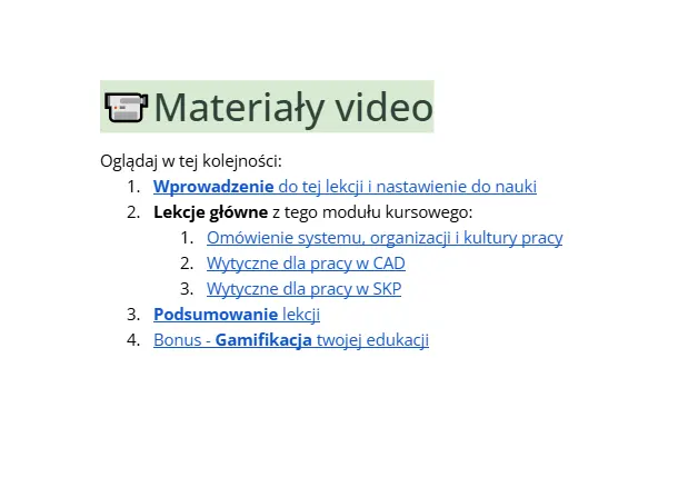 Rdzeniem materiałów kursowych są checklisty projektowe. To kompletne instrukcje jak działać, by nie pominąć żadnego szczegółu oraz gwarancja powtarzalności efektów. Będziesz pracować na swoich projektach, mając nasze procesy otwarte na drugim ekranie. Odhaczasz punkty i masz pewność, że każdy projekt jest kompletny. W module wdrożenia osadzamy Cię w tym świecie i instruujemy jak się w nim poruszać, aby osiągnąć maksymalną wydajność pracy projektowej.